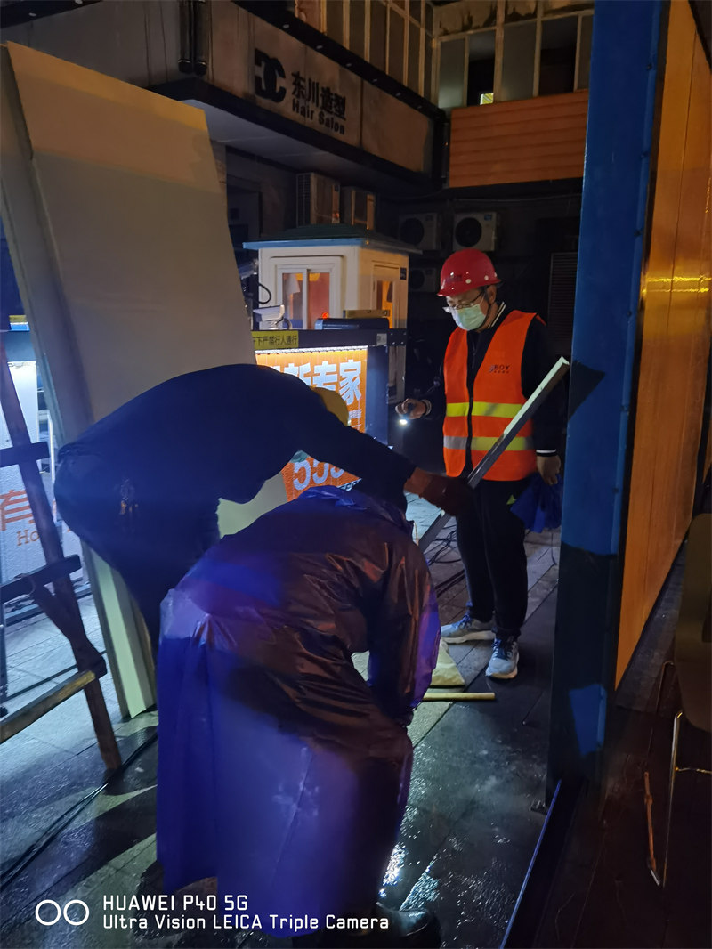 突击队员们冒雨施工,多个工作面迅速铺开,不放过任何一处细节。凌晨5:30,经过一夜鏖战队员们拖着疲惫的身躯终于迎来了完工时刻。突击队队员们化作一把把抗疫“利剑”,熬夜奋战的辛劳与付出筑起一方坚实的抗疫堡垒。